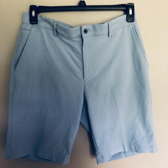 Breathable moisture-wicking COOLMAX fabric keeps you dry. The heathered texture gives these shorts a cottony look while the feathery fabric and breathability deliver the premium performance needed to take on the heat. Our Player Fit Woven Short is engineered using an innovative blend of our proprietary performance fabric making it an essential for every golfers wardrobe. The material wicks moisture and is very breathable. The Roosky Golf Short is a lightweight 100 Polyester short with a micro herringbone pattern. Featuring a herringbone-print pattern and 10 inseam these shorts provide freedom of movement. Great condition other colors available. The Newburn Golf Short crafted from 96 Polyester 4 Spandex offers a Player-specific rise and waistband. Halo color is classic Dark Navy Fabric contents.